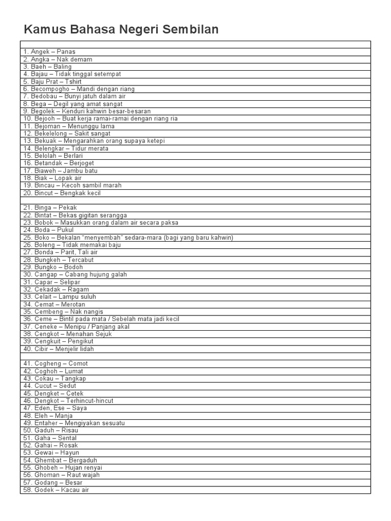 نجري سمبيلن دار الخصوص. Jadi admin kongsikan kepada anda Kamus Loghat Negeri Sembilan untuk anda buat rujukan. Admin ingin kongsikan kepada anda semua antara perkataan-perkataan yang terdapat dalam Loghat Negeri Sembilan.